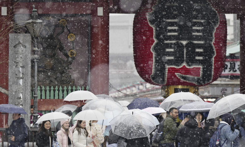 La Agencia Meteorológica de Japón dijo que se esperaba que las nevadas alcanzaran su punto máximo el lunes por la noche, con hasta 55 centímetros (21 pulgadas) pronosticados en las zonas montañosas al norte de Tokio.