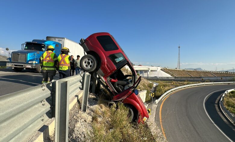 Estupefactos quedaron los automovilistas, al observar una camioneta que quedó “colgada” de una barrera metálica en la carretera Saltillo-Zacatecas, en el entronque a Derramadero.