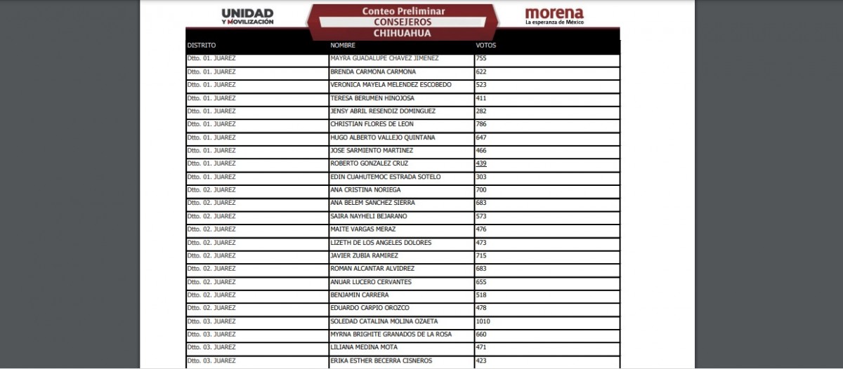 Esta mañana el partido Morena dio a conocer la lista de los 90 consejeros electos, para los 9 distritos electorales federales del Estado de Chihuahua, tras la elección del pasado domingo.