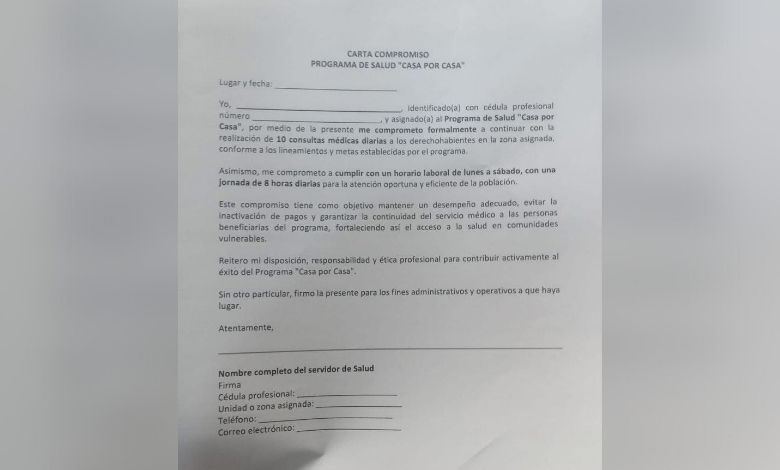 Cómo muestra de las exigencias en el cumplimiento de las metas del programa hacia los médicos y enfermeras, llamados facilitadores, mostró la carta compromiso que deben firmar donde se detalla que deben cumplir con 10 consultas médicas diarias hacia los derechohabientes en la zona asignada.